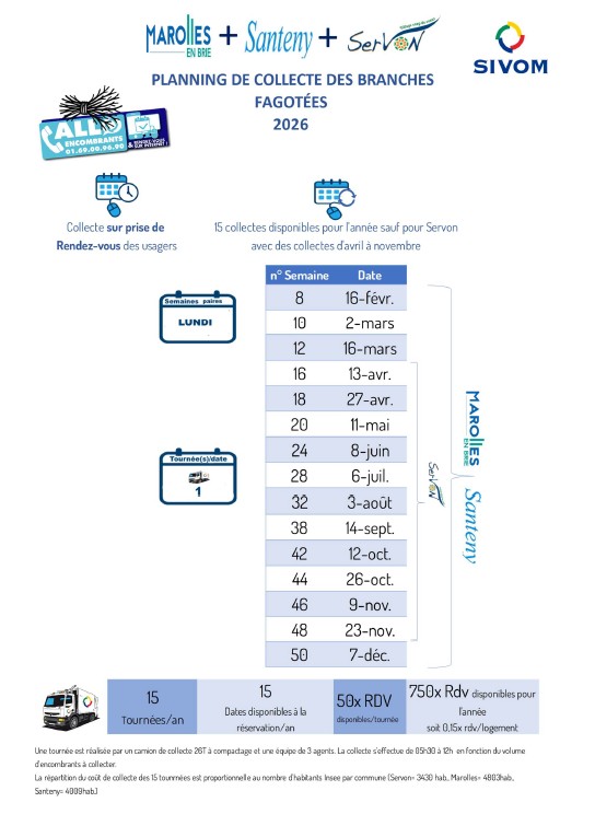 pour les coupes de petit et moyen volume (branchages de moins de 80 cm de long et moins d’1 cm de diamètre, rassemblés en fagots et liés), à partir de septembre la collecte des branchages passe sur rendez-vous. Vous devez prendre rendez-vous auprès du SIVOM pour planifier vos collectes, par téléphone au 01.69.00.96.90.